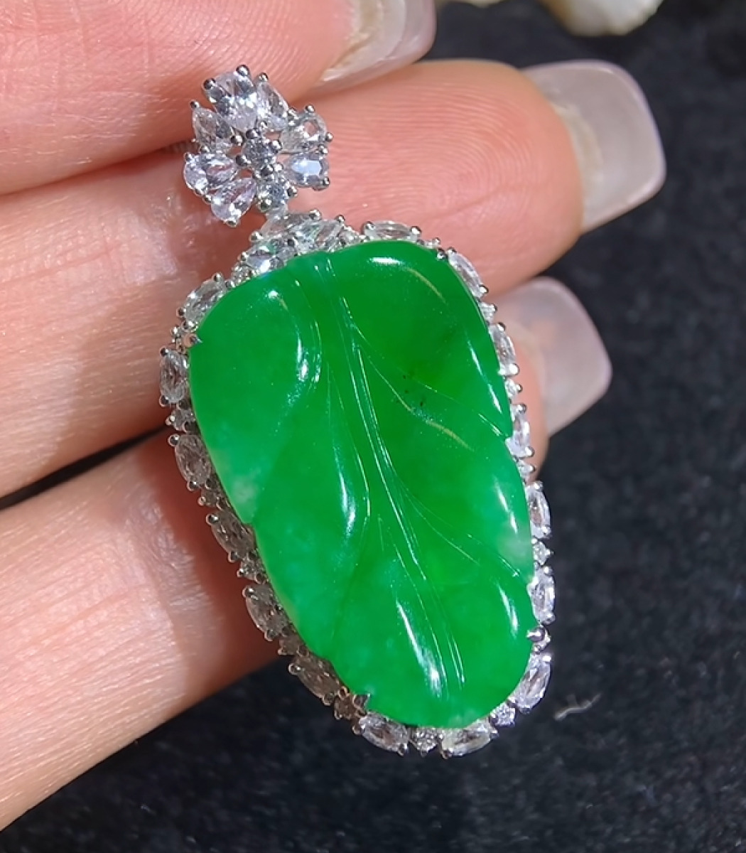 18K Platinum Diamond Jade Leaf Pendant (Wood and Earth)
